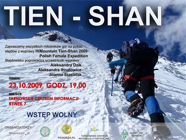 Wszystkich zainteresowanych serdecznie zapraszam w imieniu swoim oraz uczestniczek "HiMountain Tien-Shan 2009 - Polish Female Expedition" na pokaz slajdów z wyprawy, który odbędzie się w piątek 23.10 w Tarnowskim Centrum Informacji (Rynek 7) o godz. 19.